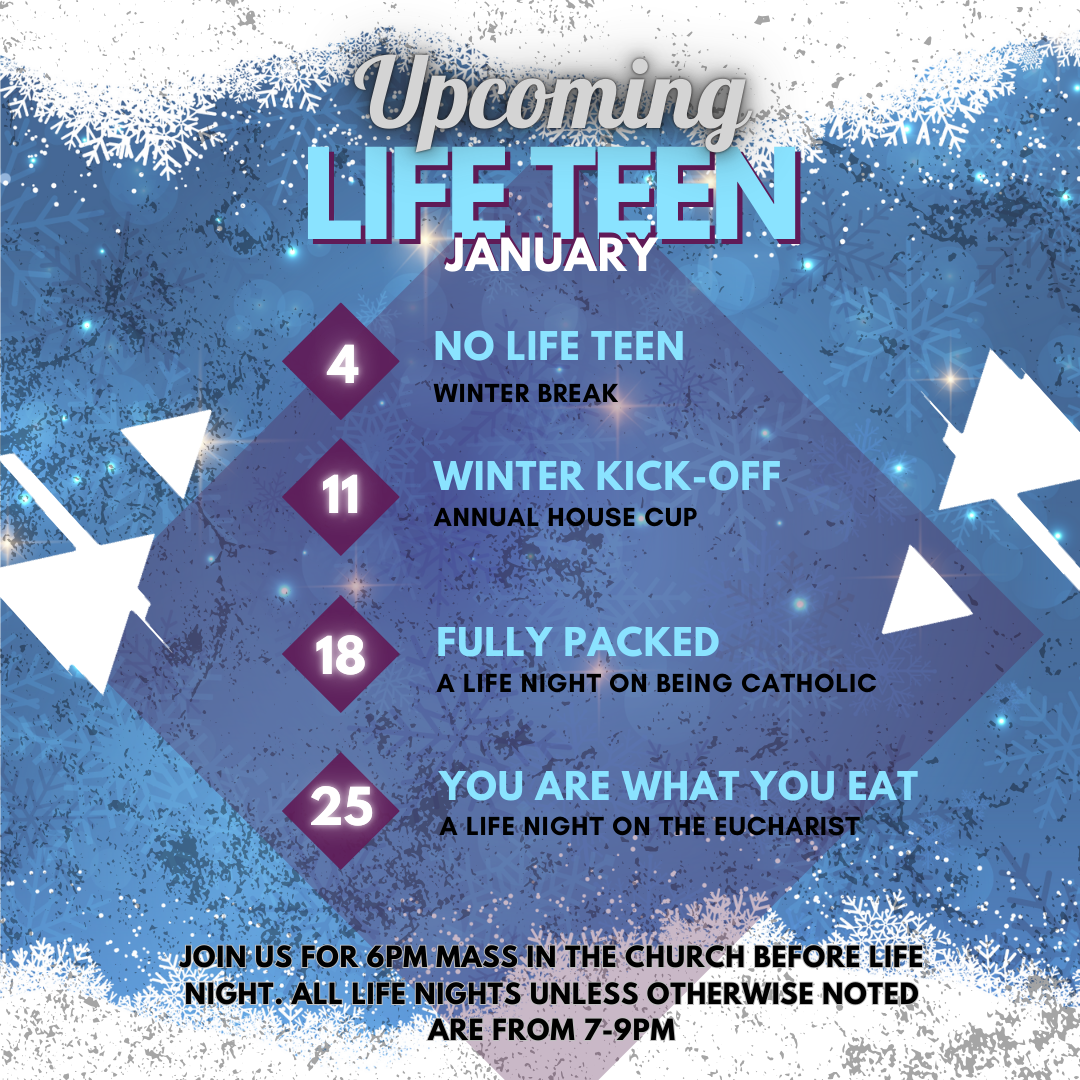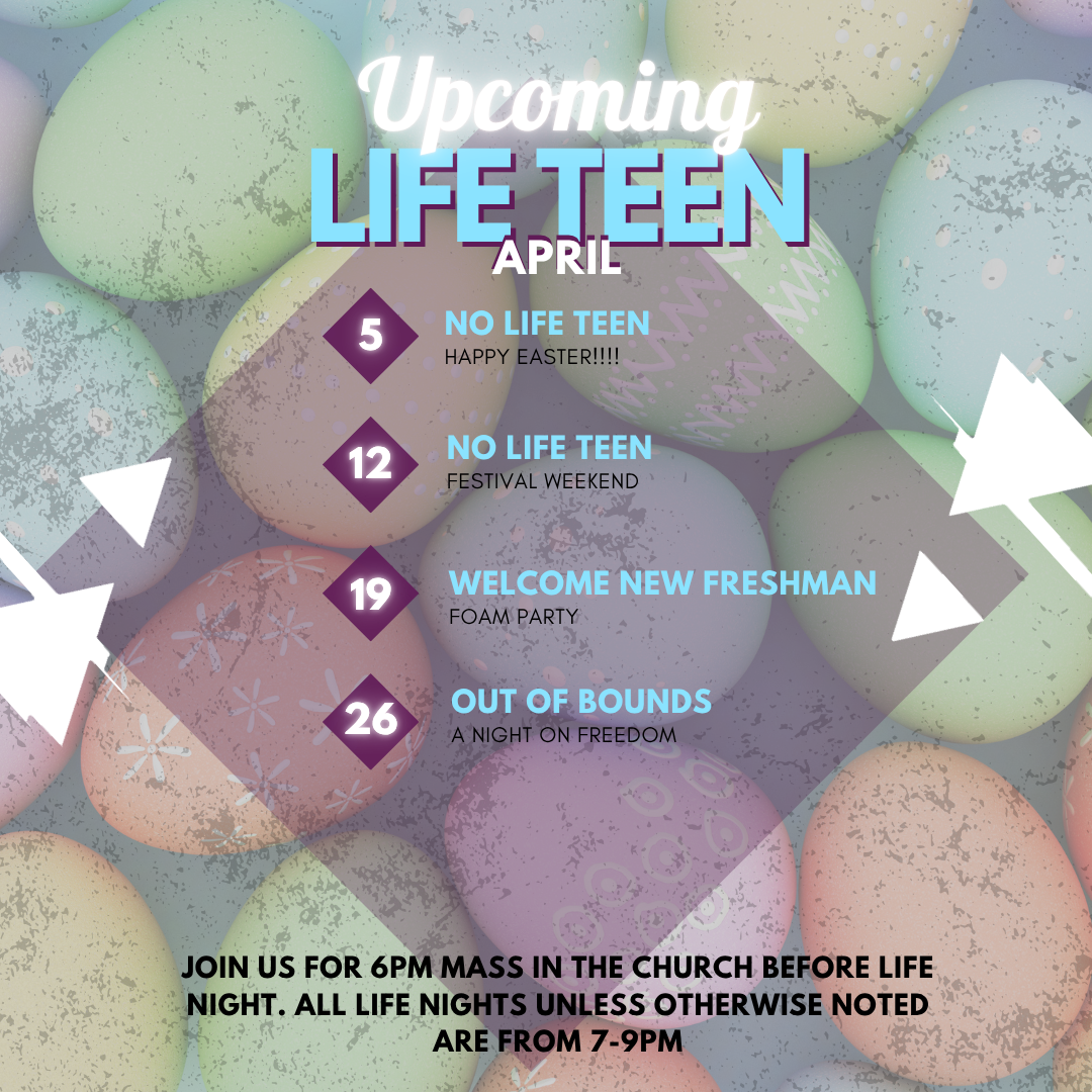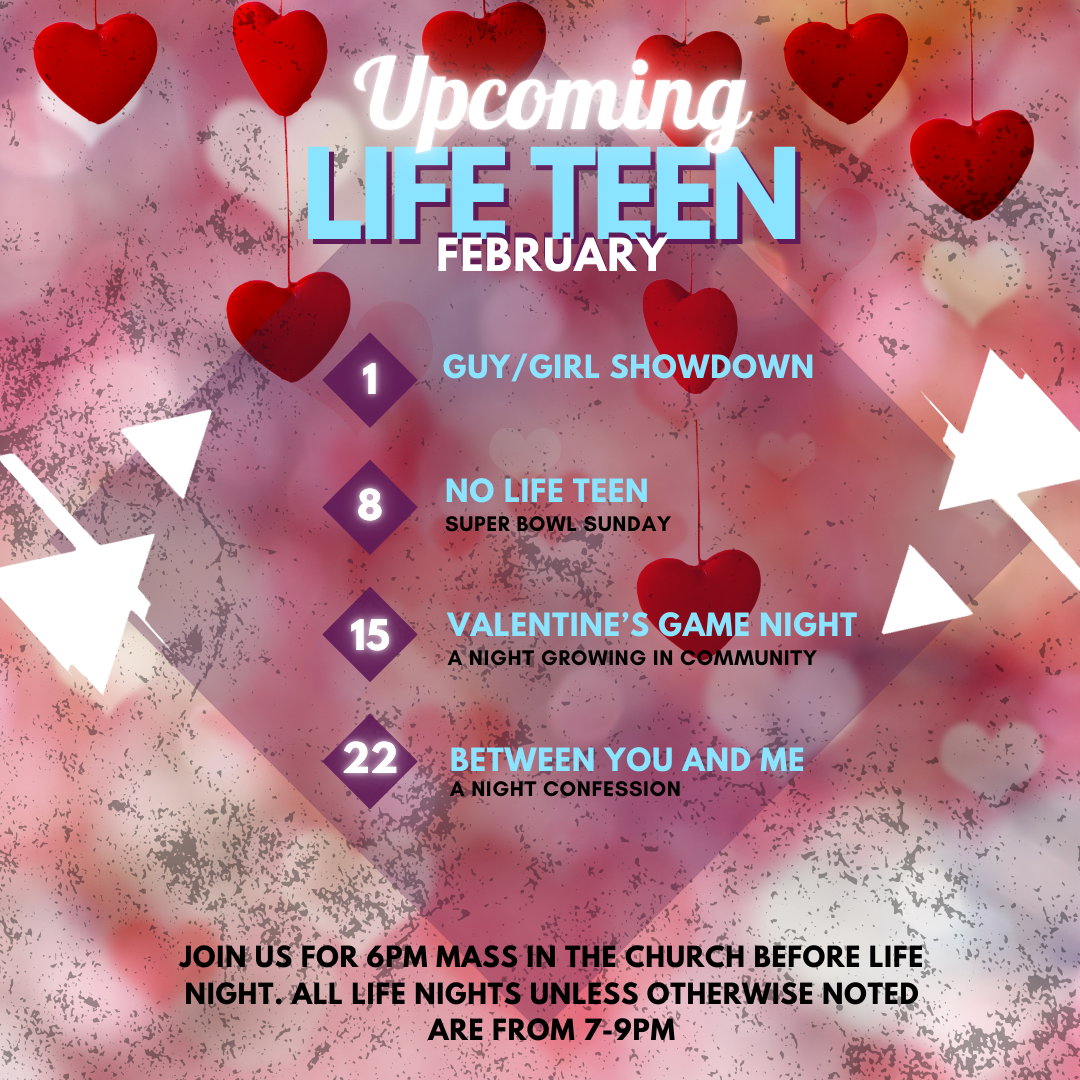 Life Nights are 7-9pm on Sundays. Make sure you are connected to our Flocknote to receive updates about weekly Life Teen events. Be sure to follow our Instagram to stay connected with everyone!
