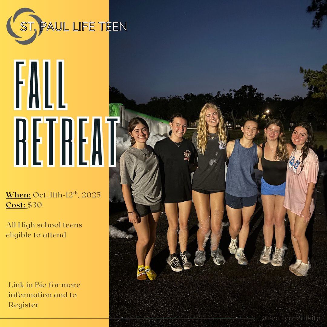 The following paperwork will need to be completed to attend retreat. All checks can be made payable to “St. Paul Catholic Church”. Please note that the “St. Paul Registration form” and the “Photo/Medical Form” are good for the entire year and only need to be filled out once for all trips.
